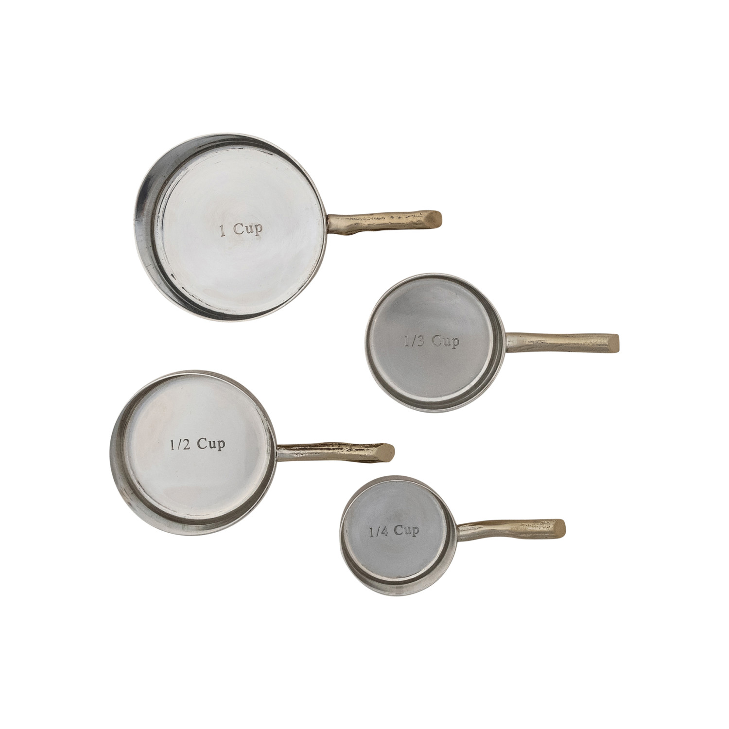 Catalog Name: 1, 1/2, 1/4 & 1/8 Cup Stainless Steel Measuring Cups w/ Etched Flowers & Brass Twig Shaped Handles, Set of 4
