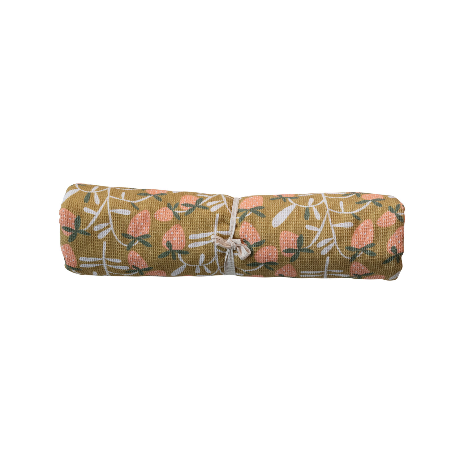 This dish drying mat is not just a practical kitchen item but also a charming addition to any space. It features a quilted terry cloth insert for extra cushioning and protection, while the outer layer is made of pure cotton with a strawberry pattern. The mat also features three coconut shell buttons for easy storage. This drying mat is perfect for drying dishes, pots, and pans, or showcasing bakeware and serveware, adding a touch of farmhouse, French country, boho, or Scandinavian style to the home. This is a beautiful and fun piece that will add some beauty and freshness to the table setting.