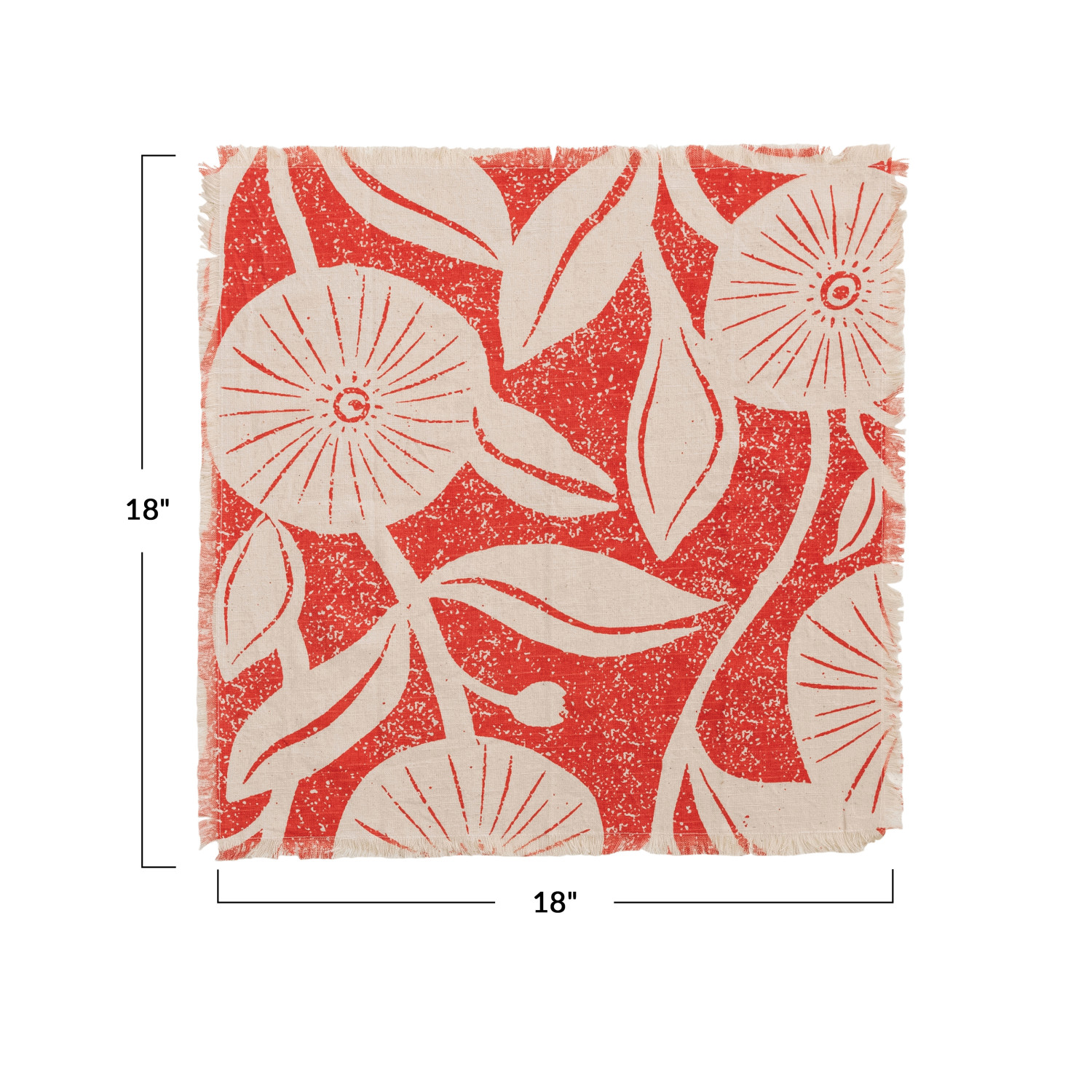 Catalog Name: 18" Square Cotton Printed Napkins w/ Floral Pattern & Fringe, Natural & Tomato Color, Set of 4 Tied w/ Cotton Tape