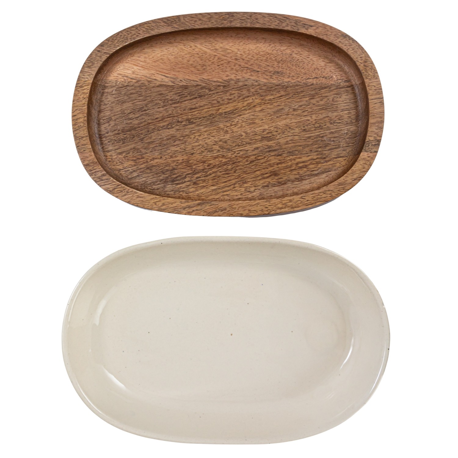Catalog Name: 12-3/4"L x 8-1/4"W x 2-1/4"H 1 Quart Stoneware Serving Dish/Casserole Baker w/ Mango Wood Base, Cream Color & Natural, Set of 2