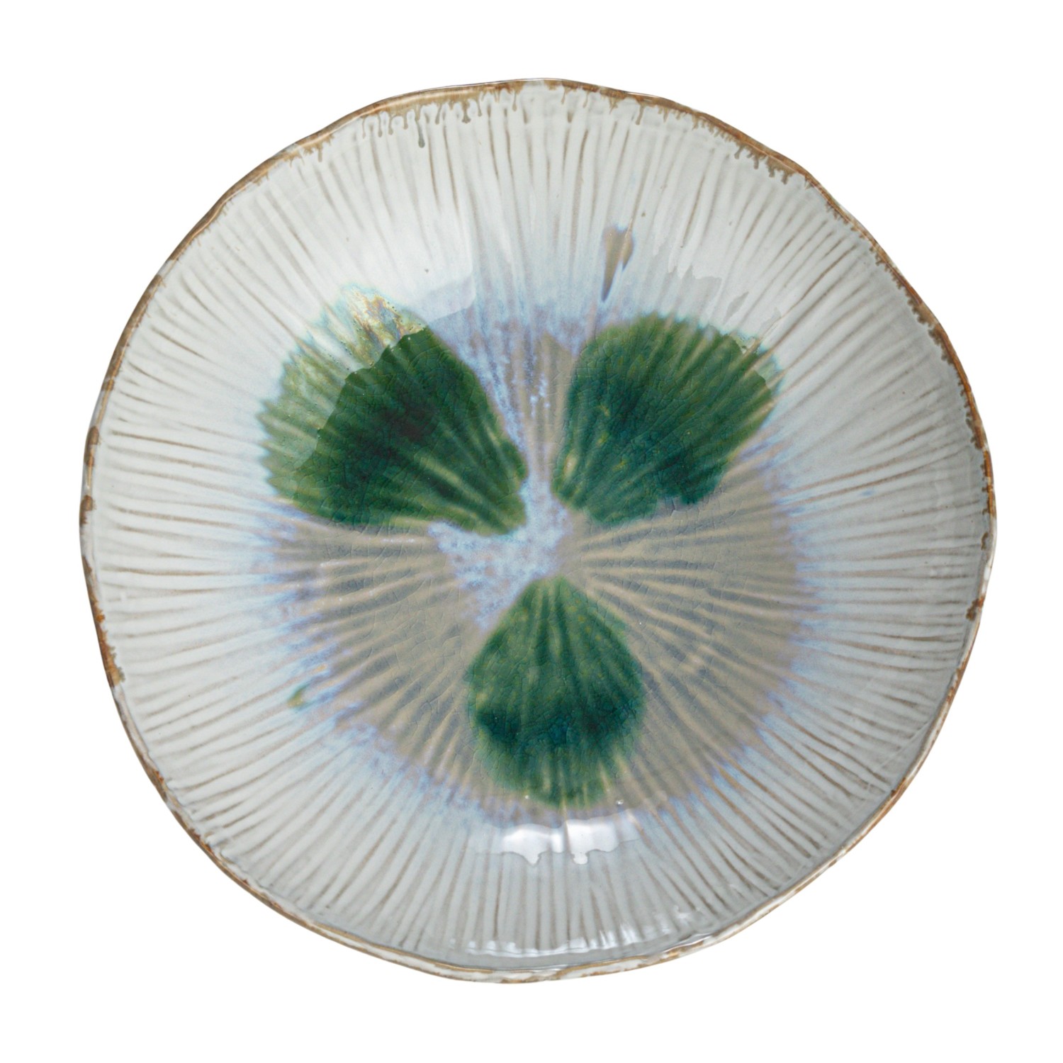This stoneware bowl with a reactive crackle glaze is a beautiful and functional addition to any home. It has a green and white surface that gives each piece a unique and artistic appearance. It can be used for serving a variety of foods, from salads and pasta to rice and soup, or for displaying fruits, flowers, or candles on a table or countertop. It can also be microwaved, ovened, and dishwashed for easy and convenient use. It measures 11.5 inches round and 2.5 inches high, and can match any farmhouse, French country, coastal, lodge, or cabin style kitchen or dining room. This will impress the guests and enhance the food presentation.