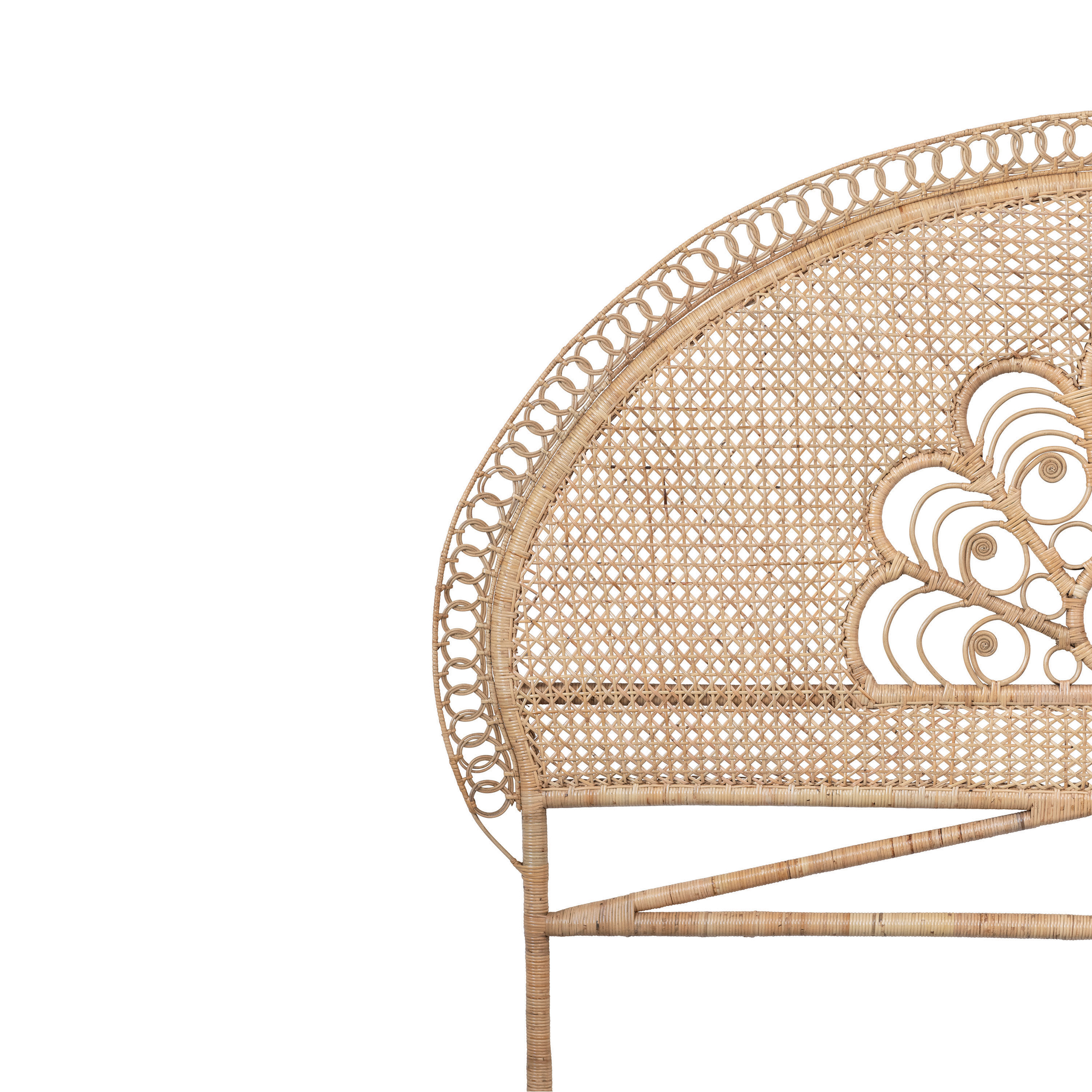 This boho-inspired headboard showcases intricately handwoven rattan in a variety of romantic designs. King size woven rattan headboard in natural finish. Add a hint of boho charm to any bedroom with this artistically crafted headboard. Made from 100% rattan.