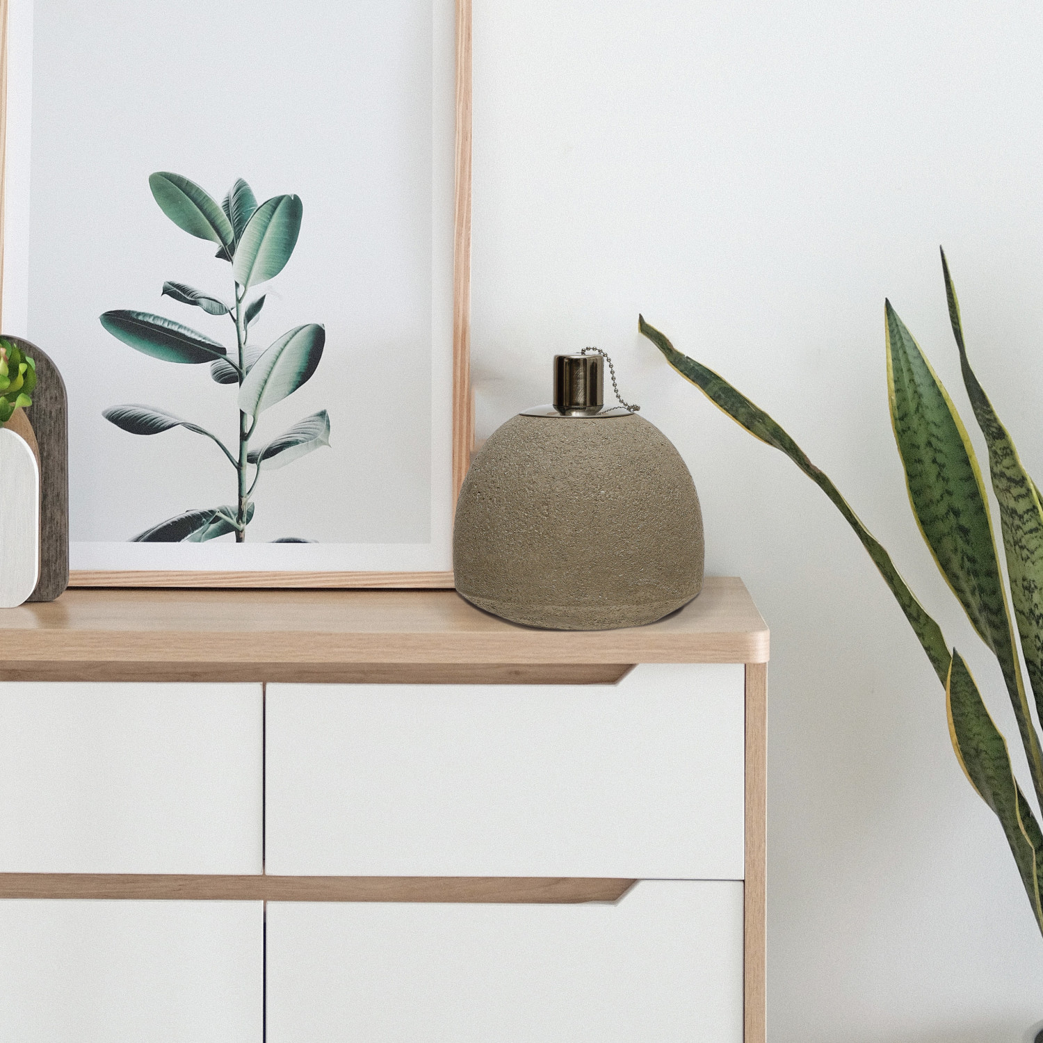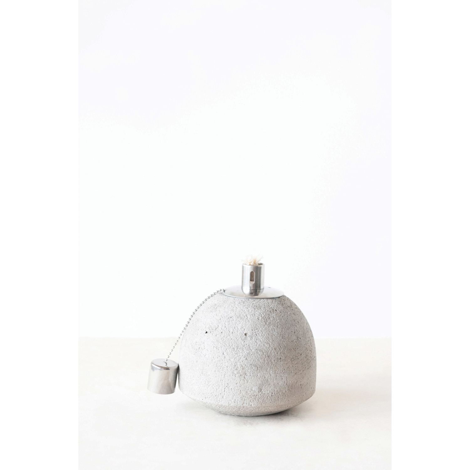This rustically modern oil lamp features organic cement construction adorned with a striking metal accent. Cement oil lamp in natural sand finish with metal accent. Add a touch of natural beauty to any bedroom or living space with this elegant oil lamp. Seamlessly transitions from any interior stylings from boho and eclectic to rustic farmhouse.