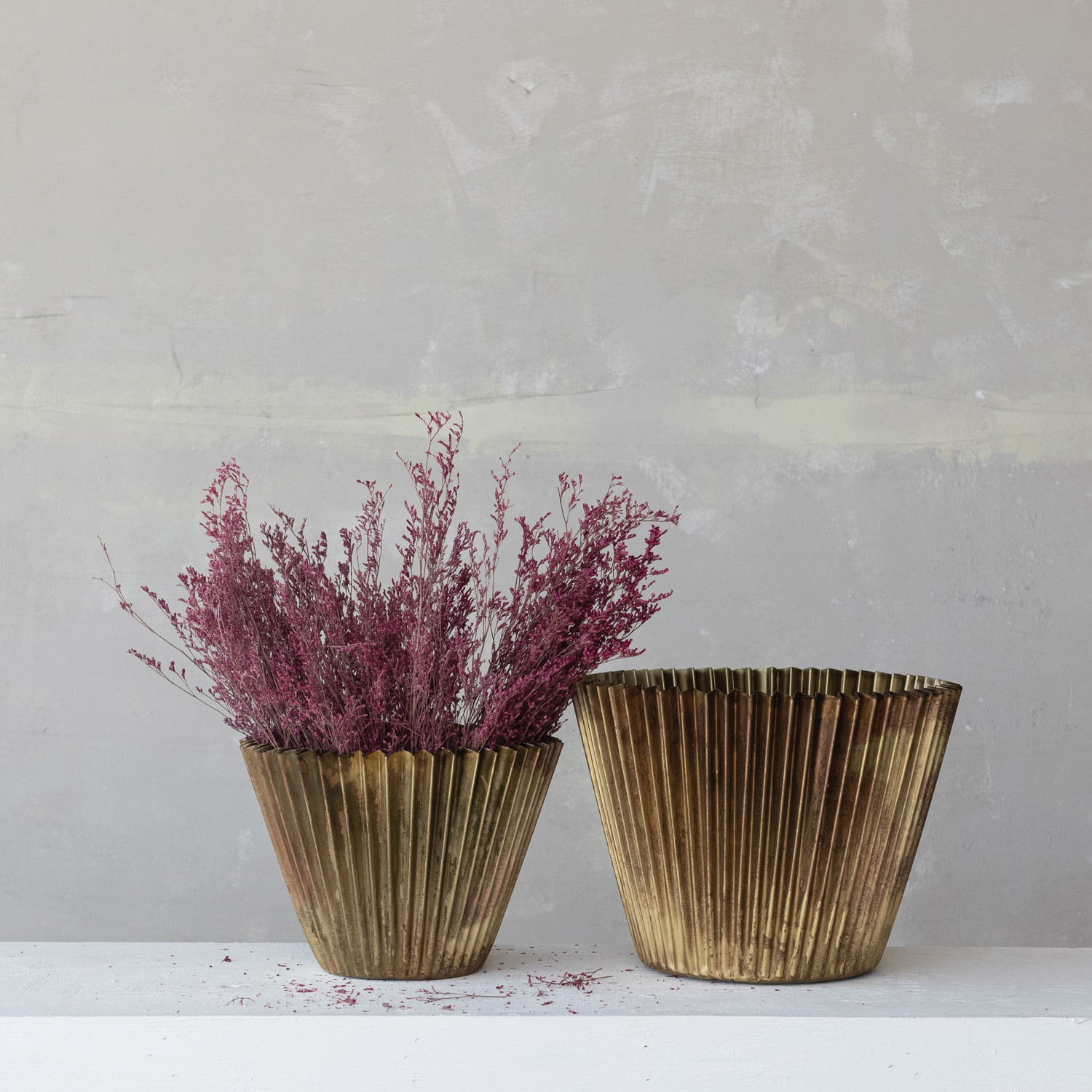 Catalog Name: 15" Round x 11-1/2"H & 12-1/2" Round x 9-1/4"H Decorative Metal Fluted Planters, Antique Brass Finish, Set of 2 (Holds 12" & 10" Pots)