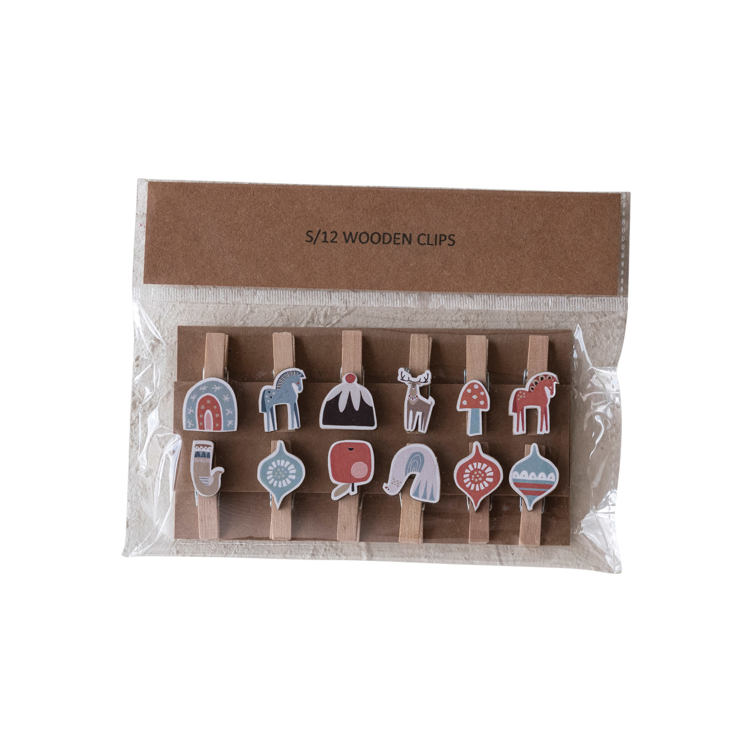 Wood & Printed Paper Holiday Icons w/ Clips, Set of 12