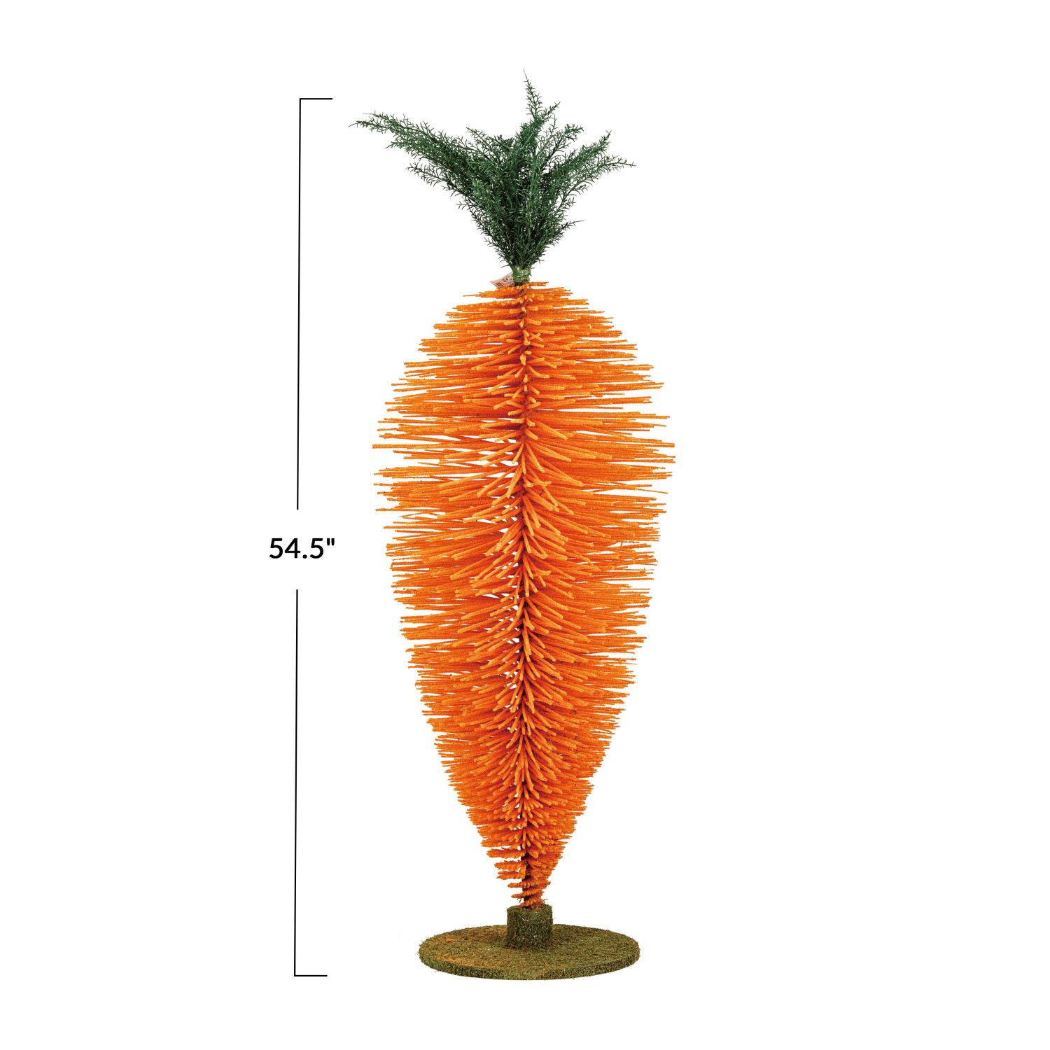 Catalog Name: 54-1/2"H Flocked Bottle Brush Standing Carrot w/ Faux Moss Finish MDF Base, Green & Orange Color