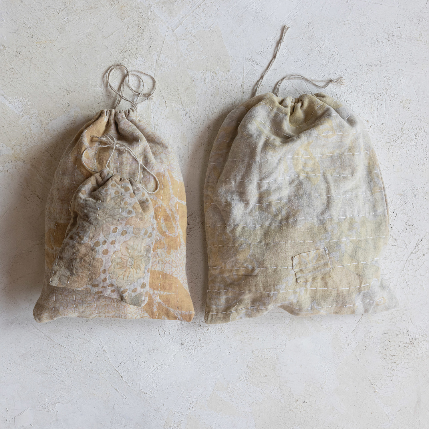Vintage Cotton Kantha Drawstring Bags, Set of 3 (Each One Will Vary)