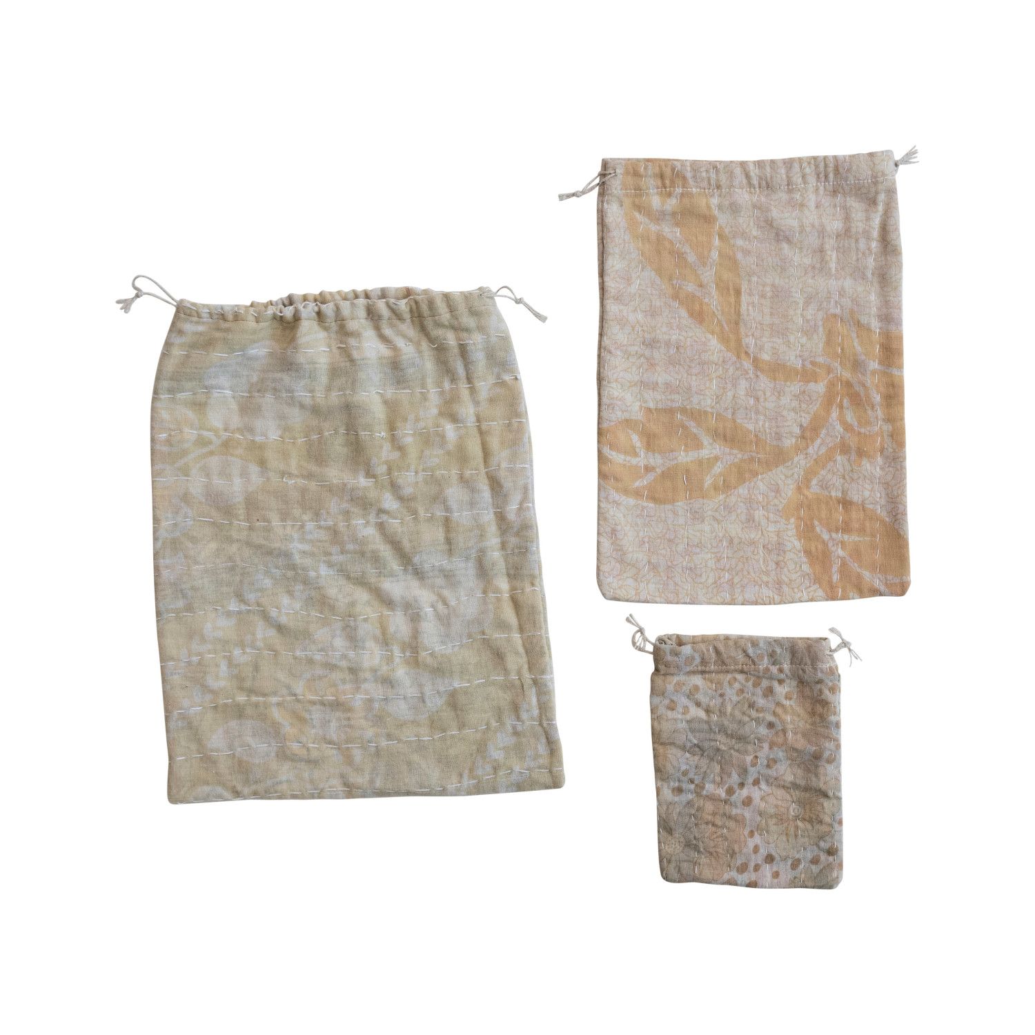 Catalog Name: 14"L x 10"W, 12"L x 8"W & 7"L x 5"W Vintage Cotton Kantha Drawstring Bags w/ Hand-Embroidered Kantha Stitch, Bleached, Multi Color, Set of 3 (Each One Will Vary)