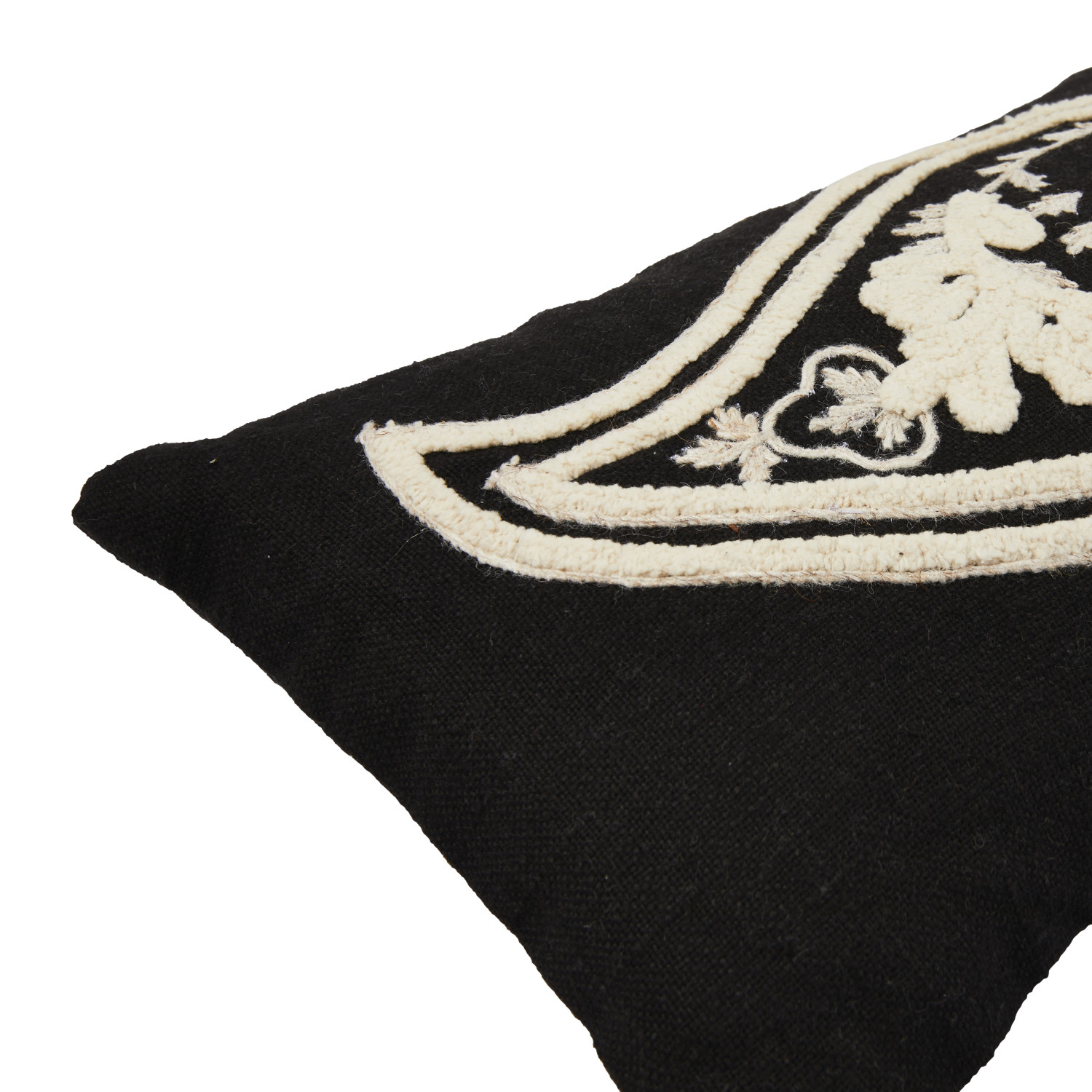 This lumbar pillow features a modern take on a classic paisley design embroidered on woven cotton slub. Woven cotton slub lumbar pillow with embroidered black and white paisley pattern; Black cotton encasement on back. Express your constantly evolving style with the simple addition of this eye-catching pillow. Removable cotton pillow cover and insert; Back zipper with hidden flap; Machine wash cold, gentle cycle; Do not bleach, warm iron if needed.