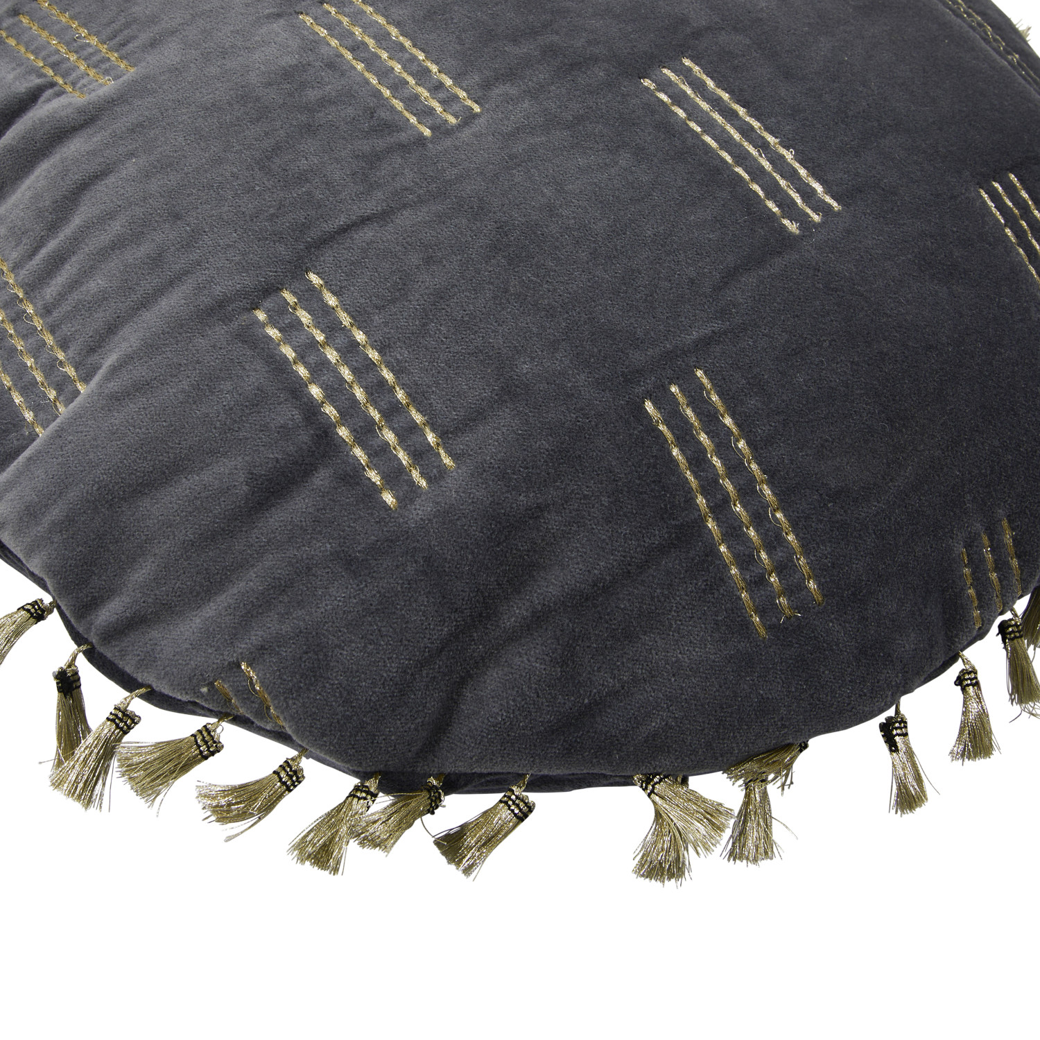 This glamorous throw pillow showcases modern metallic embroidery on luxurious cotton velvet, finished with decorative tassels. Round blue and gold cotton velvet throw pillow with metallic embroidery and tassels; Tonal cotton velvet encasement on back. Express your constantly evolving style with the simple addition of this eye-catching pillow. Removable throw pillow cover and insert; Back zipper with hidden flap; Hand wash cold, do not bleach, warm iron if needed.