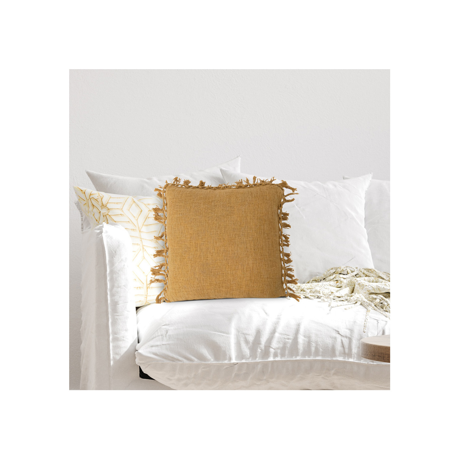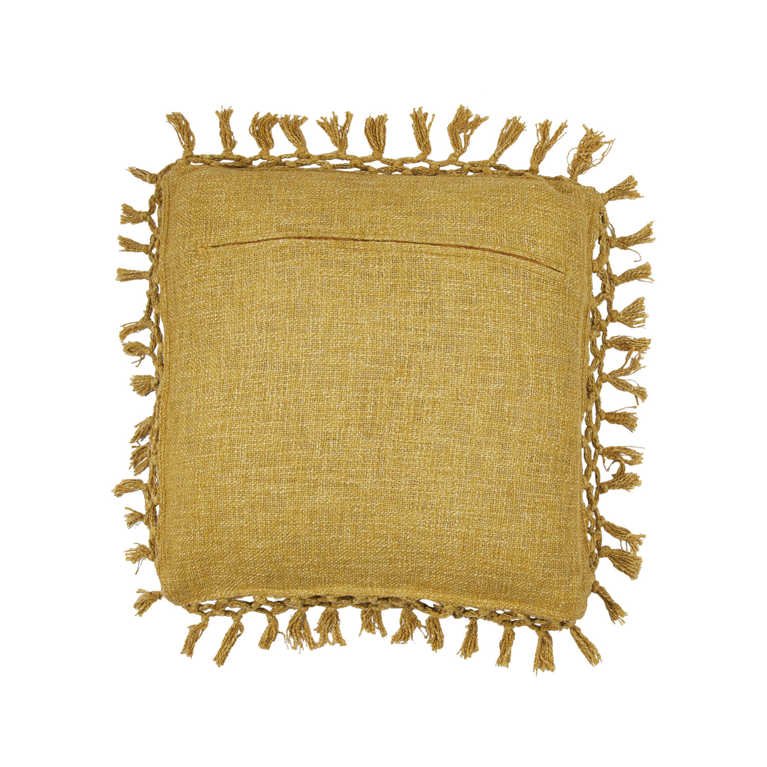 This boho-inspired throw pillow cover showcases soft cotton slub construction adorned with intricately crocheted fringe detail. Square mustard cotton slub throw pillow with crocheted fringe. Express your constantly evolving style with the simple addition of this eye-catching pillow. Removable cotton throw pillow cover with polyester insert; Hand wash, warm iron if needed.