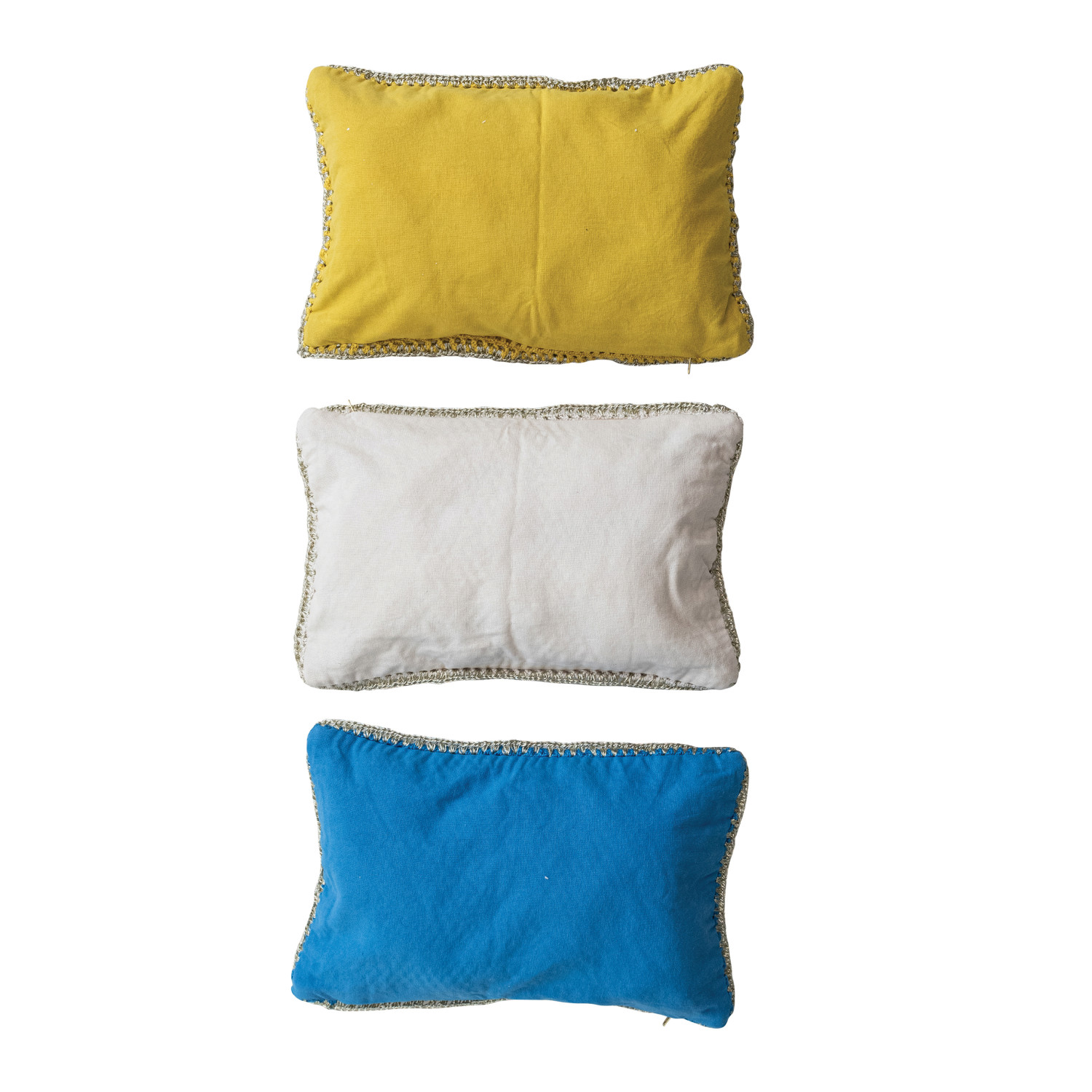 Catalog Name: 14"L x 9"H Cotton Blend Crocheted Lumbar Pillow w/ Metallic Silver Trim & Interior Lining, 3 Colors