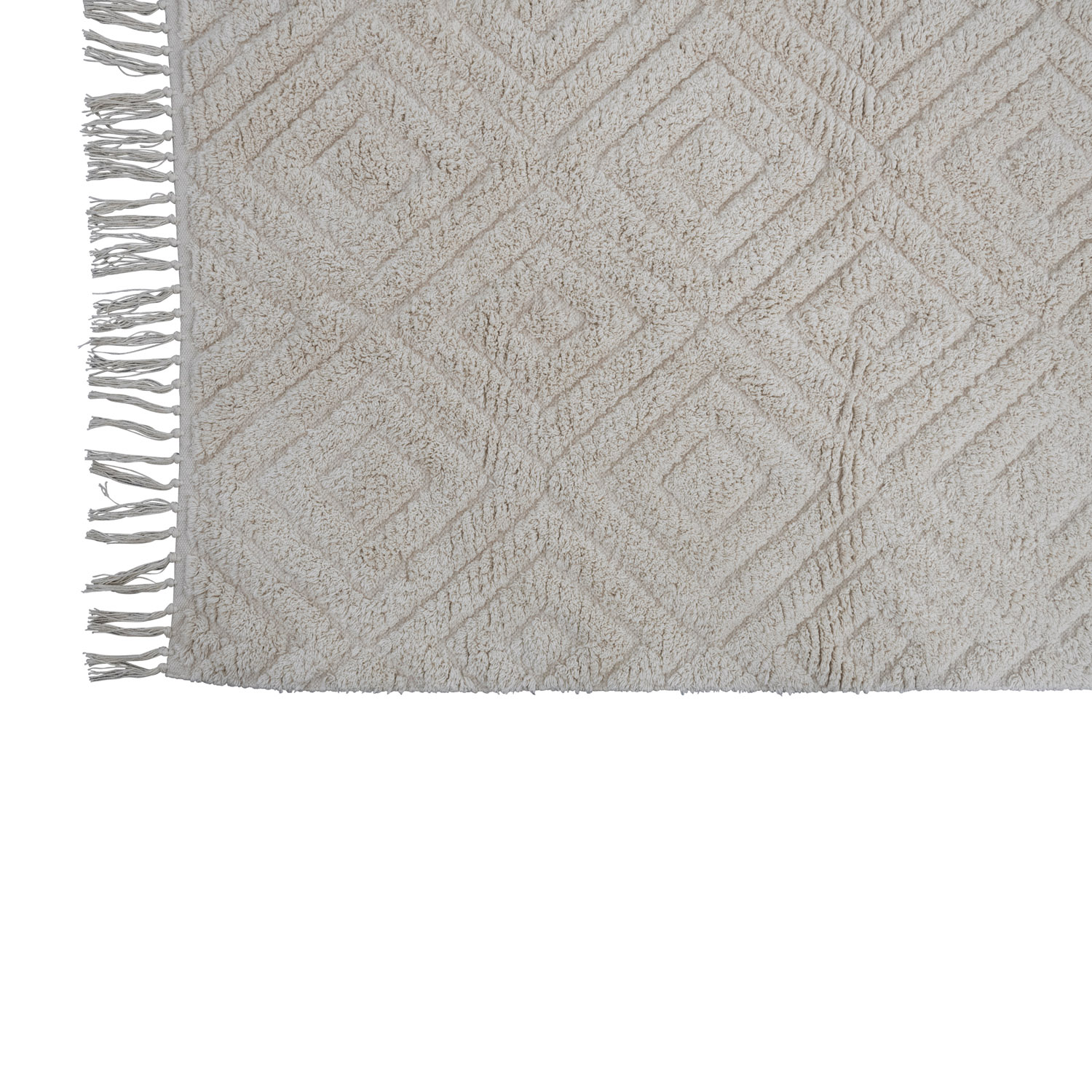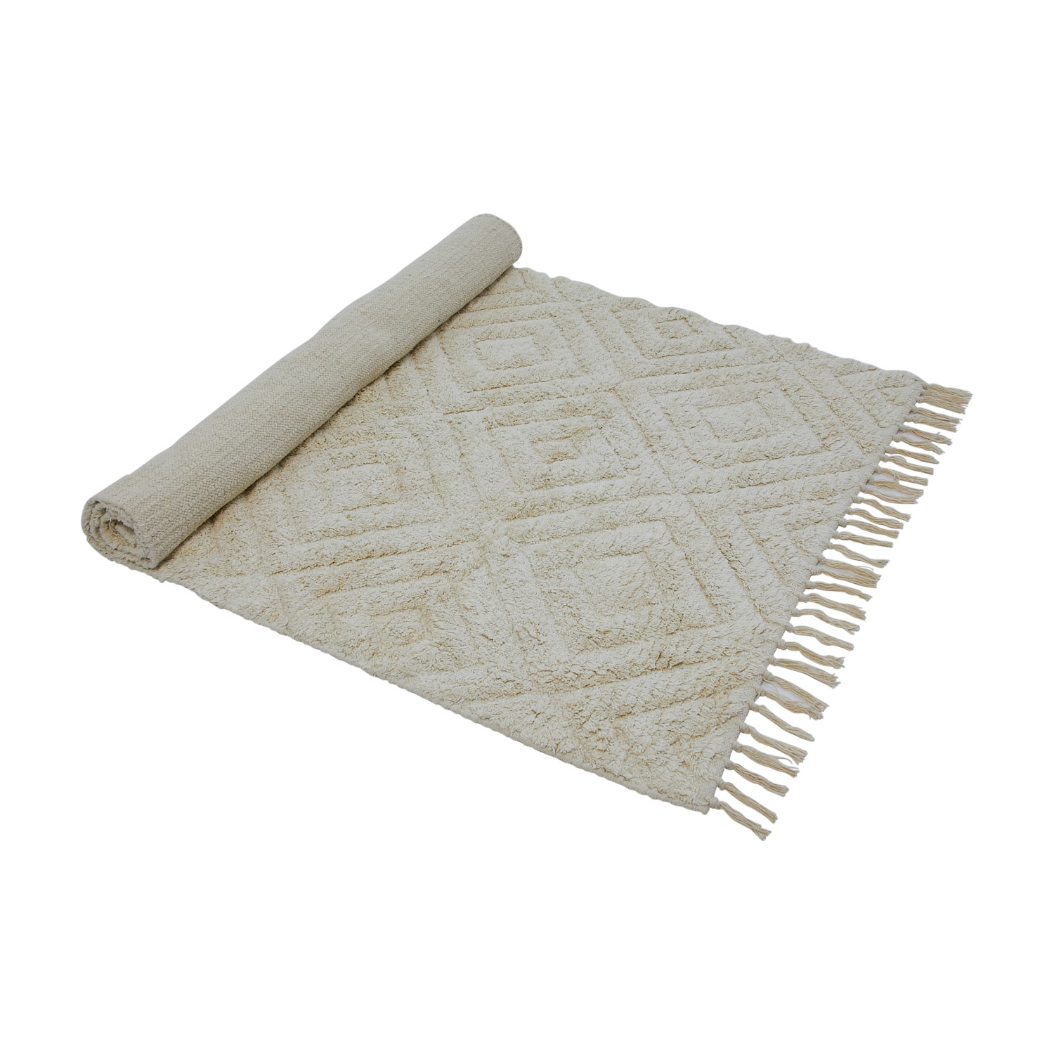 This cozy throw rug features a tufted diamond pattern on supple cotton with decorative fringe. Cream cotton tufted rug with diamond pattern and fringe. Spot Clean Only. 97% Cotton, 3% Other Fibers.